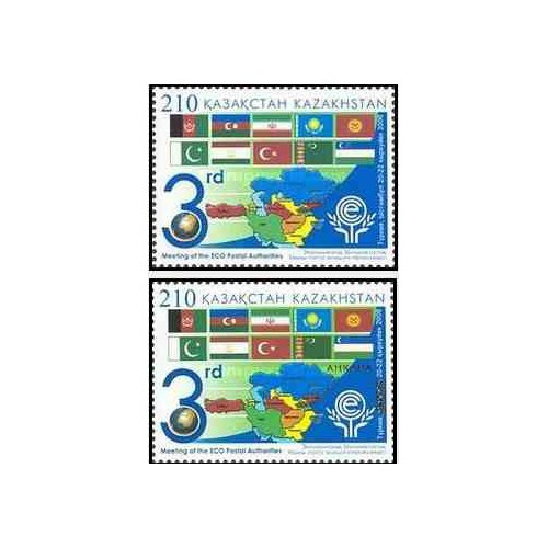 2 عدد تمبر سومین نشت مقامات پستی اکو -با و بدون سورشارژ -  پرچم و نقشه ایران -  قزاقستان 2006 قیمت 8.9 دلار
