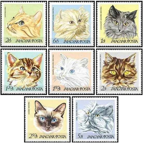 8 عدد تمبر گربه های اهلی - یکی از تمبرها گربه پرشین - مجارستان 1968 قیمت 7 دلار