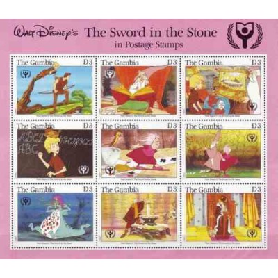 • مینی شیت کارتونی والت دیسنی - سال بین المللی با سوادی - شمشیر در سنگ - گامبیا 1991 قیمت 23 دلار