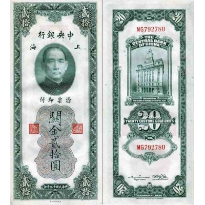 CHINA 1930 - Central Bank of China - 20 Customs Gold Units - American Bank Note Company, New York - issued to facilitate Customs payments; after WWII used also for general circulation - title at right: "Asst. General Manager