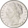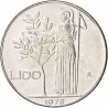 - Front: Standing goddess Minerva (Etruscian and Roman goddess of wisdom and sponsor of arts, trade, and defense) holding a young tree and a pole between (left, value) L.100 (Lire) and (right, mint mark) R (= Rome)