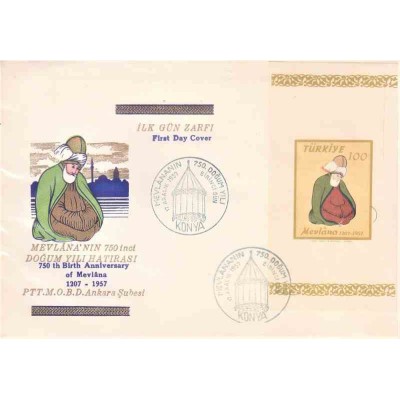 پاکت مهر روز هفتصد و پنجاهمین سالگرد تولد مولانا - ترکیه 1957